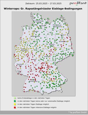 Der Insektizid-Einsatz in dieser Woche kann mit einem noch geplanten Wachstumsregler kombiniert werden. Allerdings wird es mit den wünschenswerten mehrtägig günstigen Bedingungen knapp; zum Wochenende wird mit einer Rückkehr des Spätwinters gerechnet. Veränderungen bei den Bienenschutzauflagen beachten. Wo es sehr trocken ist, die Wachstumsregler-Aufwandmengen reduzieren. Phoma-Blattflecken stehen dieses Frühjahr in den Hauptanbaugebieten des Rapses nach überwiegend trockenem Februar und März nicht im Fokus. Die meisten der angebauten Rapssorten sind nicht nur standfest, sondern auch weniger anfällig für Phoma.