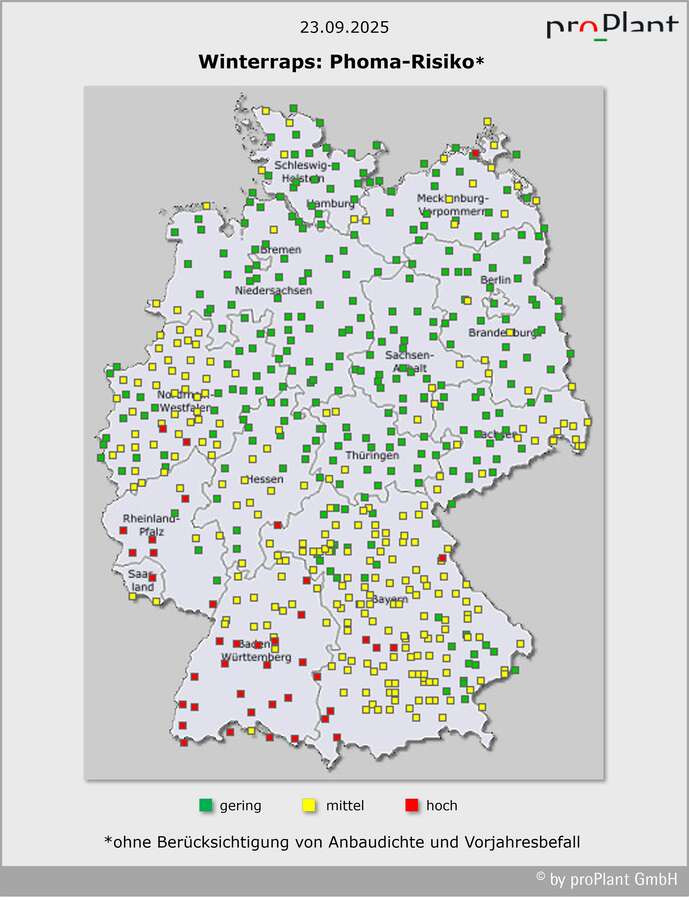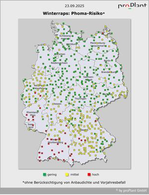 Falls noch nicht geschehen, gleichmäßig aufgelaufenen und insgesamt zügig gewachsenen Raps mit 4 oder mehr Blättern einkürzen; ab Ende der Woche werden die Bedingungen dafür besser, wenn es wieder etwas milder wird. Bestände, die erst 4 oder weniger Blätter haben, neigen nicht mehr zum Überwachsen. Auf den Schlägen, auf denen kleine, nachaufgelaufene Rapspflanzen die Lücken schließen sollen, sollten diese noch nicht mit einem Wachstumsregler gebremst werden. Auch warten, wenn der Raps nicht wachsen will (z.B. Trockenheit, Herbizidstress). Stellt sich feucht-milde Witterung ein, kann später im Herbst noch reagiert werden – bei Bedarf auch gegen Phoma. Aktuell ist der Befall mit Phoma-Blattflecken noch nicht kritisch. Aber das wetterbedingte Befallsrisiko ist im Südwesten Deutschlands nach ergiebigen Niederschlägen angestiegen. Anfälligere Sorten sollten dort nun regelmäßig auf Befall kontrolliert werden: Die Flecken sind gelblich-braun bis grau mit weißgrauem Zentrum und kleinen schwarzen Sporenlagern (Pyknidien). Man findet sie auf den älteren Blättern der bereits größeren Pflanzen. Bei diesen war die Wahrscheinlichkeit vor 10-14 Tagen größer, dass Phoma-Sporen auf einem Blatt gelandet sind statt auf dem Boden. Bis Sonntag dieser Woche werden Niederschläge in der Südhälfte Deutschlands das Risiko für Phoma-Befall weiter ansteigen lassen. In der Nordhälfte soll es dagegen überwiegend trocken bleiben, so dass die Gefahr für Blattbefall vielerorts noch gering bleibt.