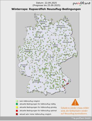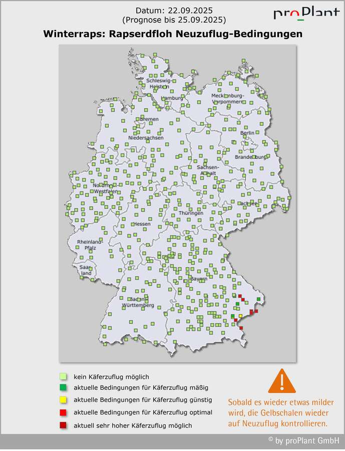 Gelbschalen kontrollieren, sofern noch nicht wieder erfolgt: Wie erwartet wurden seit letzter Woche weitere Erdflöhe bei sonniger und warmer Witterung in Gelbschalen gezählt. In manchen Schalen sind es mittlerweile mehrere Hundert Käfer. Besonders betroffen sind die „Hotspots“ in Schleswig-Holstein, Thüringen und Sachsen. Aber auch von Ostniedersachsen bis Brandenburg und in Mecklenburg-Vorpommern haben die Fangzahlen deutlich zugenommen. Regional und schlagweise sind die Unterschiede enorm. Nicht weit von hohen Erdfloh-Zahlen entfernt wurden nicht mal 10 Tiere oder gar keine gefangen. Deutschlandweit gesehen zeigt sich das „Erdfloh-typische Ost-West-Gefälle“. Auffallend ist dieses Jahr jedoch der vergleichsweise hohe Erdflohbefall in einigen südwestlichen Landstrichen Deutschlands. Bedenklich ist, dass in der Region zwischen Karlsruhe und Heidelberg inzwischen pyrethroid-resistente Rapserdflöhe mit der sog. super-kdr Mutation gefunden wurden. Die herbstlich kühle Witterung in dieser Woche wird keinen nennenswerten Neuzuflug zulassen. Beim nächsten Anstieg der Temperaturen sollten die Gelbschalen wieder auf Erdflöhe kontrolliert werden.
