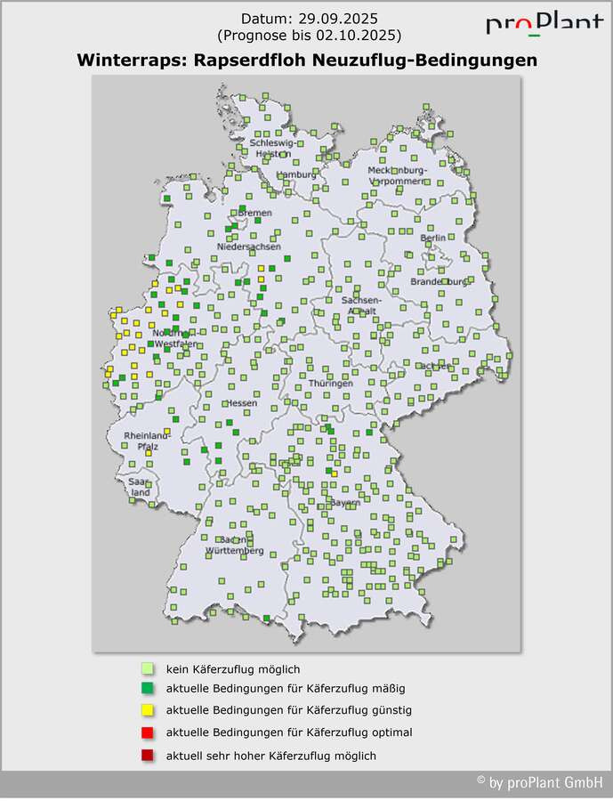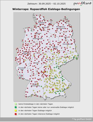 Die seit 22. September herbstlich-kühle Phase hat den Zuflug des Rapserdflohs etwas gebremst. Nach den regional etwas milderen letzten Tagen sind die Gelbschalen zu kontrollieren, falls noch nicht erfolgt. Im Laufe dieser Woche sinken die Temperaturen wieder sukzessive ab – nennenswerter Neuzuflug ist nicht zu erwarten. Die Gelbschalen pflegen. Denn es muss bei wieder ansteigenden Temperaturen noch mit weiterem Zuflug gerechnet werden. Die regionalen und schlagspezifischen Unterschiede bei den Käferfängen zeigen wieder einmal, dass nur eigene Gelbschalen eine vernünftige Entscheidungsgrundlage erlauben. Erdflöhe, die bis etwa Mitte September zugeflogen sind, legen bereits Eier ab.