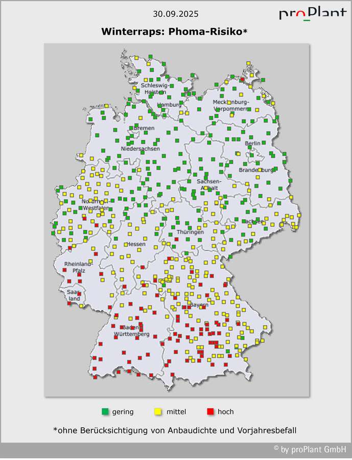 Der August war auf ganz Deutschland gesehen etwa 30 % zu trocken (verglichen mit dem langjährigen Mittel), danach folgte ein etwa 30% zu nasser September. Allerdings brachte dieser nur dem Südwesten Deutschlands viel Niederschlag. In Nord- und Mitteldeutschland blieb es dagegen gebietsweise sehr trocken. In der Südhälfte Deutschlands sollte mittlerweile auf Phoma-Blattflecken geachtet werden, insbesondere bei den anfälligeren Sorten. Aus infektionsfördernden Niederschlägen in der vergangenen Woche kann ab dieser Woche nach und nach Blattbefall sichtbar werden (Flecken auf den älteren Blättern: gelblich-braune bis graue Flecken mit hellem Zentrum und darin kleine schwarze Sporenlager). Wo Phoma in den letzten Jahren keine Rolle spielte, dürfte allerdings kein großer Befallsdruck vorhanden sein. Das am Wochenende angekündigte stürmische Schauerwetter wird weitere Infektionen fördern und auch das in der Nordhälfte Deutschlands bislang eher geringe Risko für Phoma-Blattbefall ansteigen lassen.
