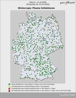 Meistens wird kein kritischer Phoma-Befall beobachtet. In Niedersachsen, Nordhessen und allen Regionen nördlich und östlich davon ist das Risiko für Blattbefall vom Wetter weiterhin gering bis mittel.