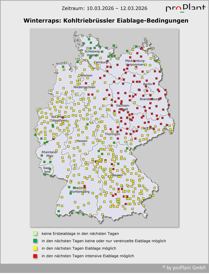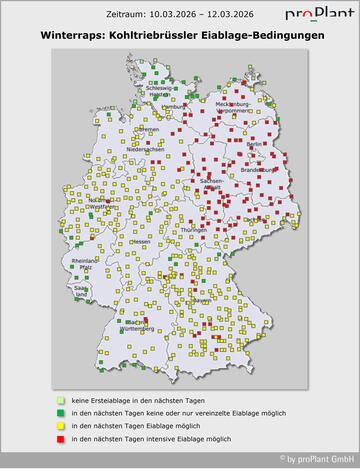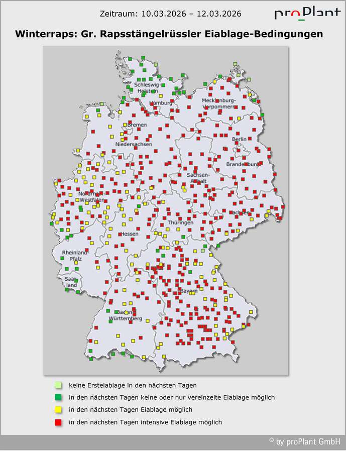 Gab es kritischen Rüssler-Zuflug erstmals seit Ende letzter Woche bzw. über das vergangene Wochenende (z.B. in Schleswig-Holstein oder Mecklenburg-Vorpommern): Der Rapsstängelrüssler beginnt 2-3 Tage nach Zuflug mit der Eiablage. Der Gefleckte Kohltriebrüssler ist nach 4-5 Tagen eiablagereif; an den kühleren Küsten braucht er 2-3 Tage länger. Falls noch nicht erfolgt, sollte die Behandlung umgehend durchgeführt werden – bevor bei wechselhaftem und windigem Wetter nicht mehr gefahren werden kann und die Rüssler ihre Entwicklung ungehindert fortsetzen.