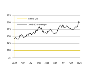 Straujš enerģijas cenu kāpums martā ir pacēlis augu eļļu cenas augstākajā līmenī vairāk nekā 3 gadu laikā. OIL WORLD pārtikas eļļu cenu indekss marta trešajā nedēļā sasniedza 205 punktus un nedēļā līdz 26. martam nedaudz samazinājās līdz 201 punktam, salīdzinot ar 177 punktiem 2025. gada marta beigās. Tas ir augstākais līmenis kopš 2022. gada jūnija (224 punkti neilgi pēc Krievijas iebrukuma Ukrainā).